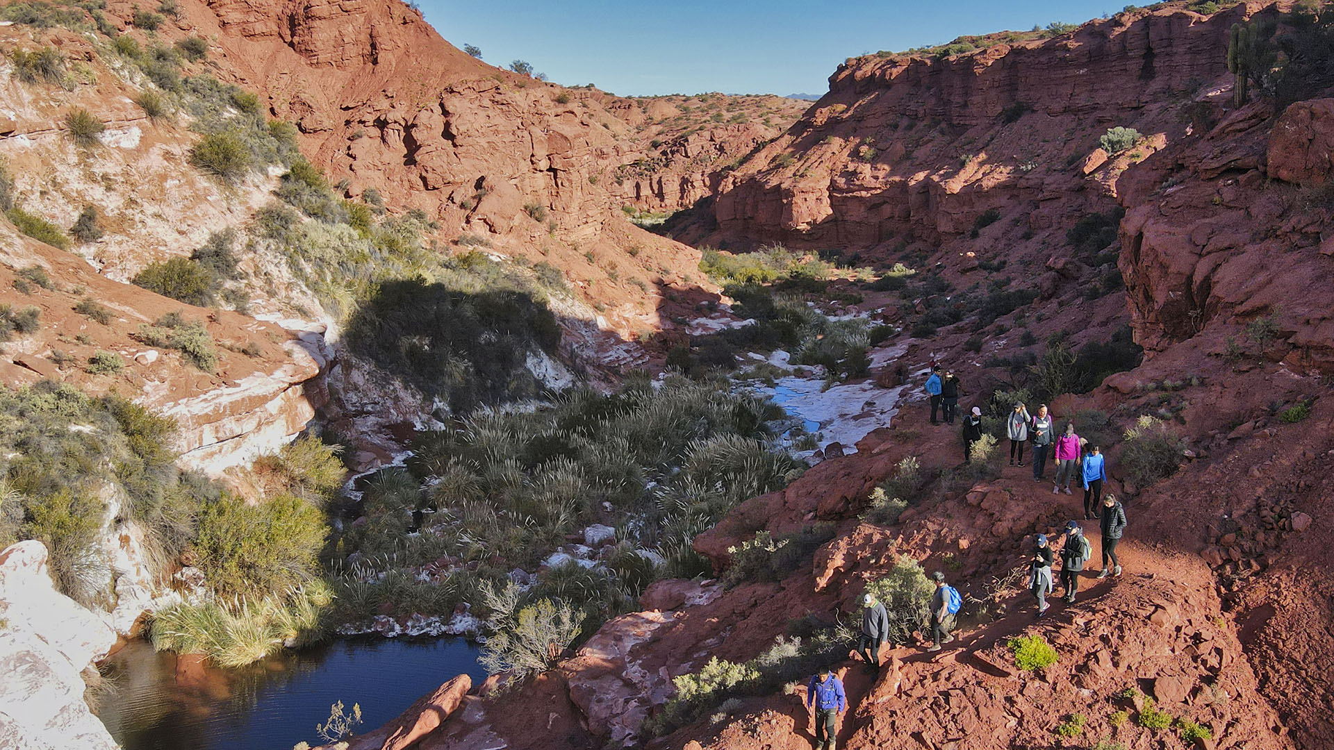 Es una excursión de senderismo que comienzo desde el estacionamiento, dispuesto para ello y al cual se accede en vehículos desde el ingreso al parque tras recorrer aproximadamente 10 kms. La misma se realiza por el lecho seco del Rio Salado, el cual más adelante empieza a tener agua y vegetación, culminado el recorrido en un gran salto de agua y laguna de color esmeralda que sorprende por su tamaño y belleza, este recorrido permite ver además hermosas formaciones geológicas que despiertan la imaginación en un marco de singular belleza y contrastes como lo es el Parque Ischigualasto.