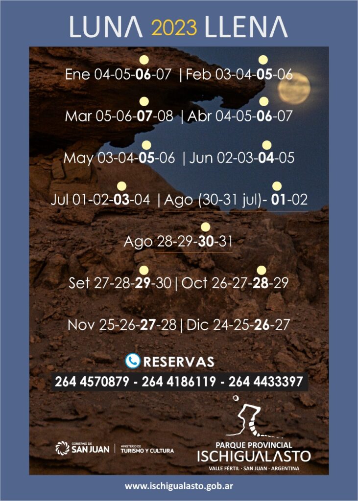 Queda habilitado el Calendario Lunar 2025. Para reservar deberá comunicarse telefónicamente o por Whatsapp a los siguientes números 264-4570879 , 264-4186119 , 264-4433397 los primeros días del mes en que realizara la excursión. Quedando sujeta la realización de la misma a las condiciones climáticas al momento de inicio del paseo.